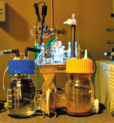 該團(tuán)隊(duì)將太陽(yáng)能電池與微生物燃料電池巧妙地整合在一起,利用太陽(yáng)能和廢水中的有機(jī)養(yǎng)分生產(chǎn)清潔能源—氫氣。這一新型裝置首先將太陽(yáng)能轉(zhuǎn)化為電能,然后將電子傳遞給廢水中的微生物使其有足夠的能量分解廢水中的有機(jī)物。其中的一些細(xì)菌在消耗有機(jī)物的同時(shí)產(chǎn)生電子,這些電子通過導(dǎo)線被傳回太陽(yáng)能用以分解水—生成氫氣和氧氣。實(shí)驗(yàn)證明,廢水中2/3的有機(jī)廢物在兩天之內(nèi)就會(huì)被分解掉。盡管凈化之后的廢水還不能直接飲用,但是如果將這一成果應(yīng)用于廢水處理廠將使得生活廢水處理過程大幅簡(jiǎn)化,更重要的是與此同時(shí)大量生產(chǎn)氫氣這一清潔能源。