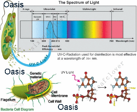 波長在240~280nm范圍內(nèi)的紫外線可以破壞細菌病毒DNA(脫氧核糖核酸)或RNA(核糖核酸)的分子結(jié)構(gòu),造成生長性細胞死亡和(或)再生性細胞死亡,達到滅菌消毒的效果。尤其是波長為254nm的紫外線,滅菌消毒的效果強且不會產(chǎn)生臭氧造成二次污染。有待于進一步發(fā)展和研究。