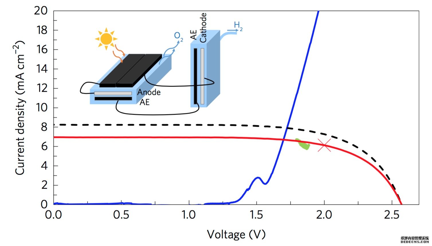 Figure 3 | Solar water splitting system with separate oxygen and hydrogen cells. Current density–voltage (J–V) characteristics of the individual components, the PV module (red curve) and water electrolysis system (blue curve), and the operation points of the coupled PV–electrolysis system (green dots). The red X marks the maximum power point of the PV module. The black dashed line curve shows the J–V characteristics of a PV module of the same model based on the vendor’s specifications. The inset shows a schematic illustration of the system.