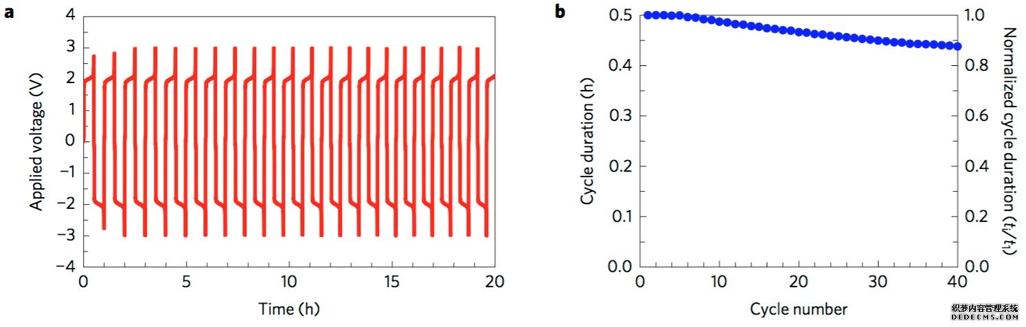 Figure 2 | Two-cell water electrolysis cycles in separate hydrogen and oxygen cells. a, Vappl as a function of time during 20 h of operation at a constant current of 45 mA (5 mA cm−2 ). b, The cycle duration plotted against the cycle number. The measurement was carried out in 1 M NaOH alkaline aqueous solution at ambient temperature.
