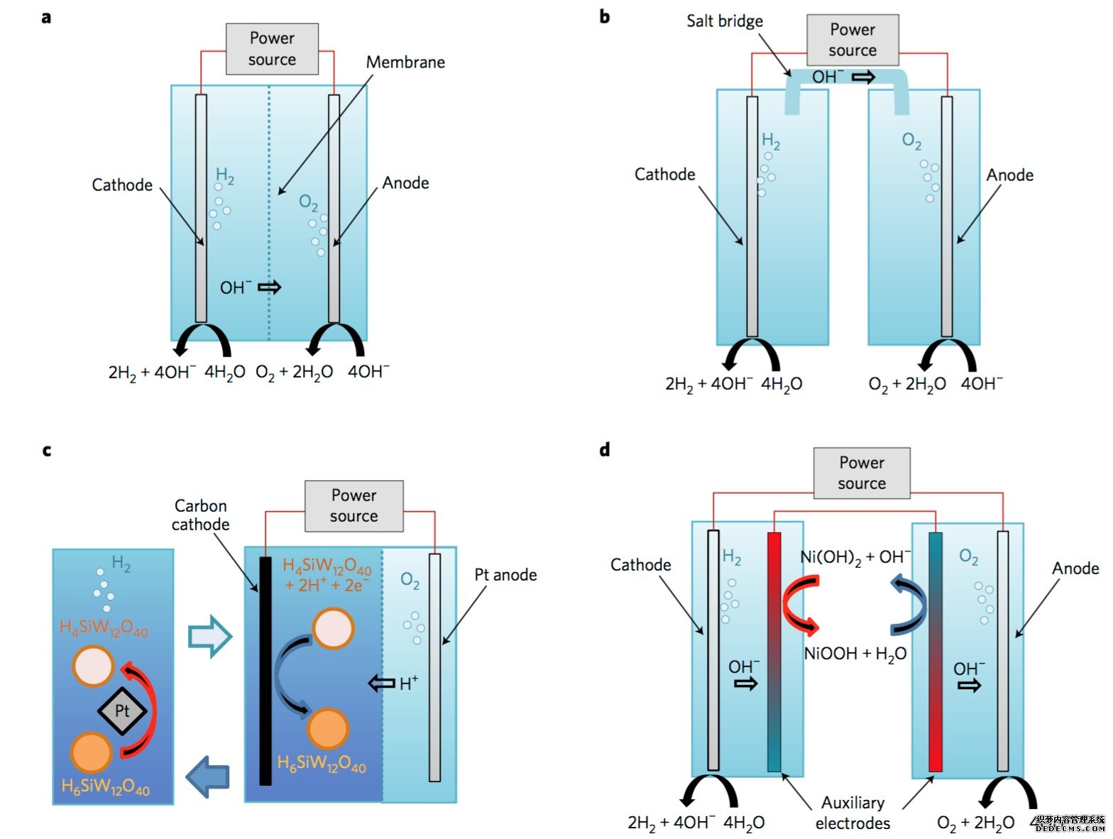 Figure 1 | Water electrolysis cell architectures. a, Conventional configuration of an alkaline water electrolysis cell. b, The same as in a with the membrane replaced by a salt bridge. c, The new PEM electrolyser configuration proposed in ref. 6 with a soluble redox mediator that enables decoupling the H2 and O2generation steps. d, Our membrane-free configuration for alkaline water electrolysis in separate hydrogen and oxygen cells8. The anode can be replaced by a photoanode or a photoanode–photovoltaic tandem stack, thus turning the electrolysis cell into a PEC water splitting solar cell that directly convert water and solar power to hydrogen fuel.